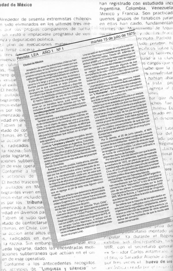 «El Mercurio» del día 23 de julio entrega en Chile la información. Curiosa- mente escribe ahora en páginas interiores y en forma escueta un subtítulo que dice: « Ejecutados por sus propios camaradas», y en letras más grandes dice: «IDENTIFICADOS 60 MIRISTAS ASESINADOS», Buenos Aires, 22 UPI: «De acuerdo con el semanario LEA, la siguiente es la nómina de miristas chilenos que habrían sido eliminados en los últimos 3 meses por sus propios compañeros de lucha», y agrega: «estas eliminaciones -dice la revista- se habrían registrado en Argentina, Colombia, Venezuela, Panamá, México y Francia y es la culminación de un largo proceso de divergencias, mutuas recriminaciones y disputas por dinero». «El Mercurio» entrega la lista.