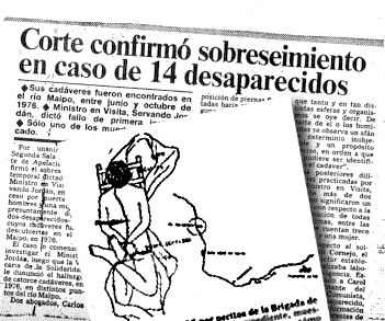 Entre el 1 de junio y el 7 de octubre de 1976 son encontrados en las riberas del río Maipo 14 cadáveres de trece hombres y una mujer. El estado en que se encontraban cinco de éstos es descrito así: