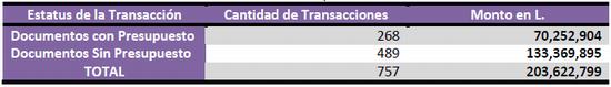 El total de transacciones en el primer semestre 2012, fue de 757, entre documentos con presupuesto y sin este, lo que representa en Lempiras, L. 230, 622,799.
